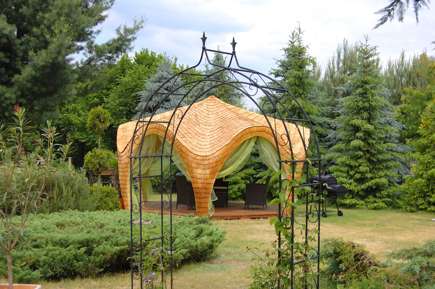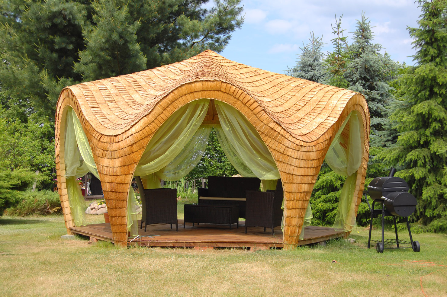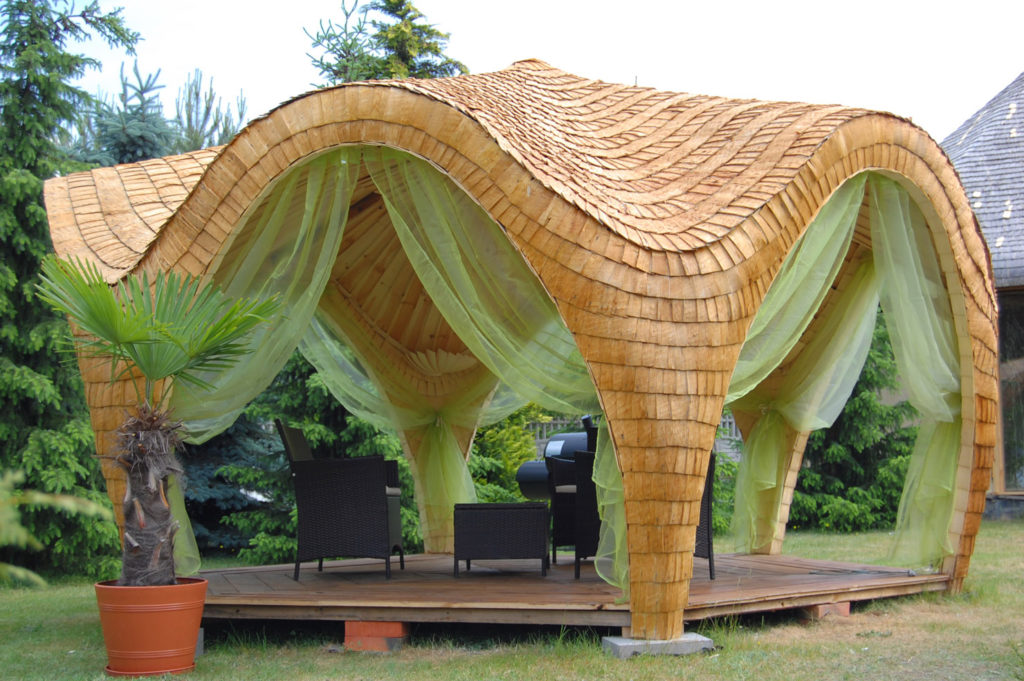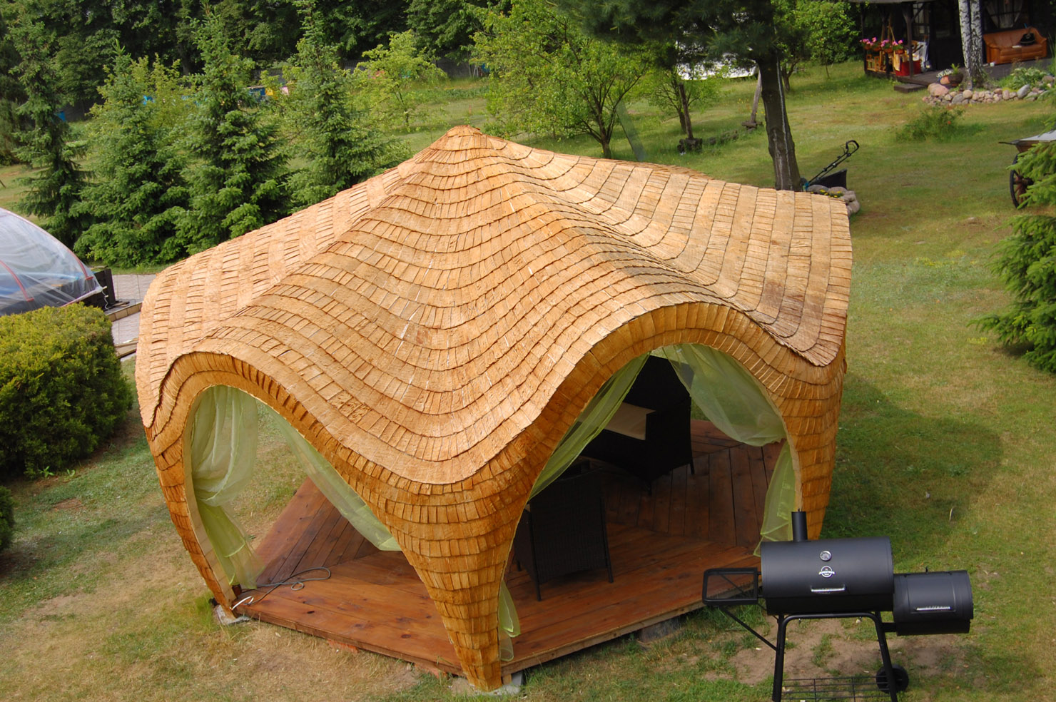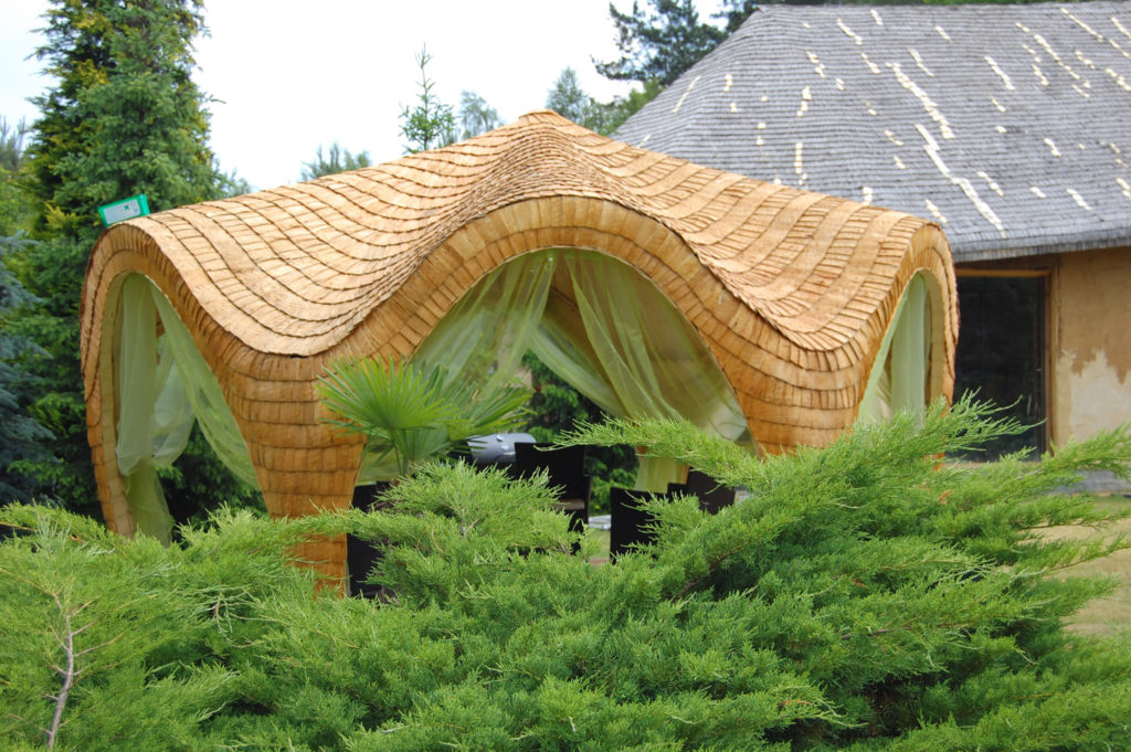 Altana Wykonana jest w całości z drewna osikowego Łupanego Gont. Jest to najbardziej trwałe naturalne pokrycie dachu (bardzo odporne na zmienne warunki pogodowe Łupane drewno (GONT). To tradycyjna 100% Ekologiczna Metoda Pokrycia Dachowego. Nie na siąka nie murszeje nie gnije, impregnowane wytrzymuje w stanie idealnym ponad 30 lat.